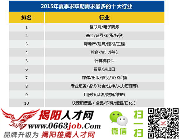 圖為2015年夏季求職需求最多的十大行業(yè),換句話講就是這些行業(yè)的發(fā)展勢頭較猛,屬于朝陽行業(yè),需要更多優(yōu)秀人才。相信大部分人都希望可以進(jìn)入一個朝陽的行業(yè),在風(fēng)口行業(yè)工作比在夕陽行業(yè)中努力更容易獲得成功。