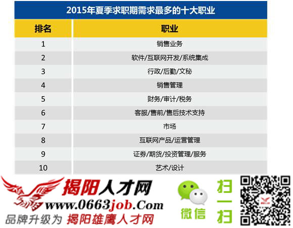 圖為2015年夏季求職期需求最多的十大職業(yè),也就是目前比較稀缺人才的行業(yè),有些職業(yè)是企業(yè)之中不可或缺的職位,有些職位則是由于行業(yè)的蓬勃發(fā)展而不斷增加的職位??傊?,這些職位決定你未來做什么,選擇時一定要慎之又慎。