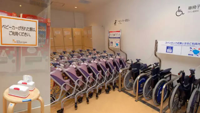 ↑為帶孩子和身體狀況不佳的顧客準(zhǔn)備的嬰兒車和輪椅設(shè)置于大門(mén)的入口附近,下車即可利用,最大限地減輕特殊顧客的體力負(fù)擔(dān)。旁邊放著消毒紙巾,用于擦拭嬰兒車。