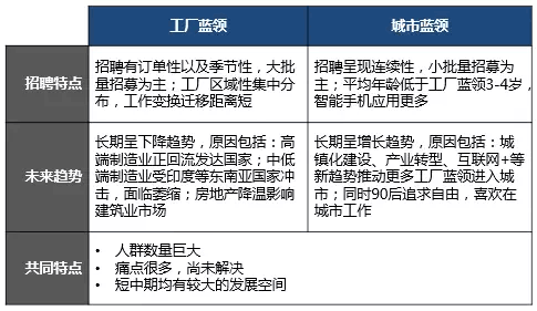 單就藍領(lǐng)群體的劃分來看,工廠藍領(lǐng)與城市藍領(lǐng)的招聘也具備不同的特點: